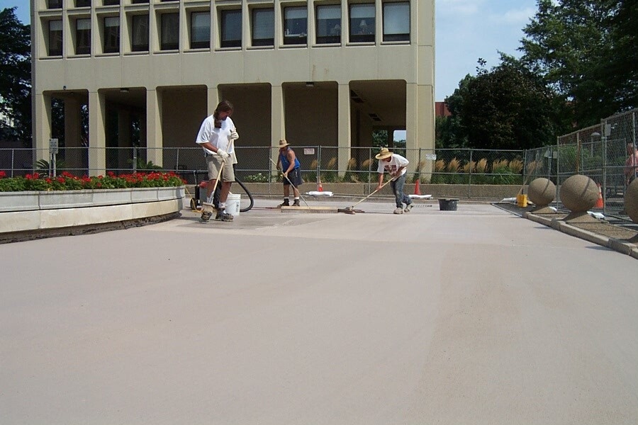 Plaza decks, balconies, walkways, driveways and other horizontal concrete surfaces are subject to wear, physical damage, staining and discoloration. These concrete surfaces need protection from water entry and environmental contaminants to prevent spalling, cracking and ultimately, failure. Elastideck bridges minor cracks, prevents water entry, protects against environmental contaminants, and provides a stain resistant textured decorative surface.