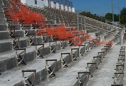 The entire Walt Snyder Stadium grandstand structure is composed of precast concrete. The project’s budget focused on filling bugholes for a specific square footage and taking proactive measures to extend the life of the structure. Plastermix was used on the stair risers at eye level to provide a very uniform texture for the most visible areas. D & A Masonry addressed bugholes on the higher level risers by using a hopper sprayer to apply Elastideck, a cementitious membrane, and then driving the Elastideck into the bugholes with drywall knives. This technique provided a very smooth surface. Elastideck was also used on the stair treads, and to mask the cold joints which were left visible after a previous phase. Super Color Stain, a water based acrylic coating, was used over the Elastideck to provide dirt and stain resistance. Both products are breathable and provide waterproofing to protect the underlying concrete. Color Coat acrylic coating was used on the undersides of the bleachers, the press box and utility shed to provide preventative waterproofing.